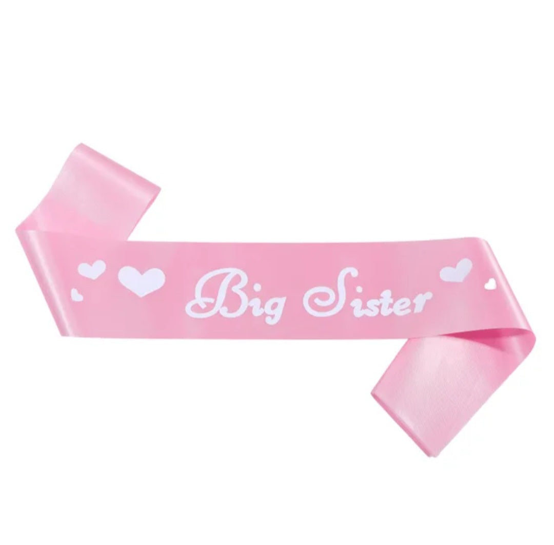 - Design: Roze sjerp met witte hartjes en sierlijke “Big Sister”-opdruk, inclusief rozet met lint.