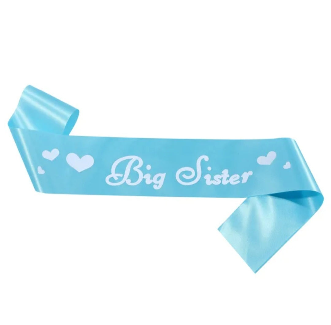 - Design: Blauwe sjerp met witte hartjes en sierlijke “Big Sister”-opdruk, inclusief rozet met lint.