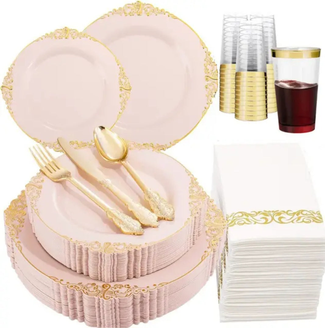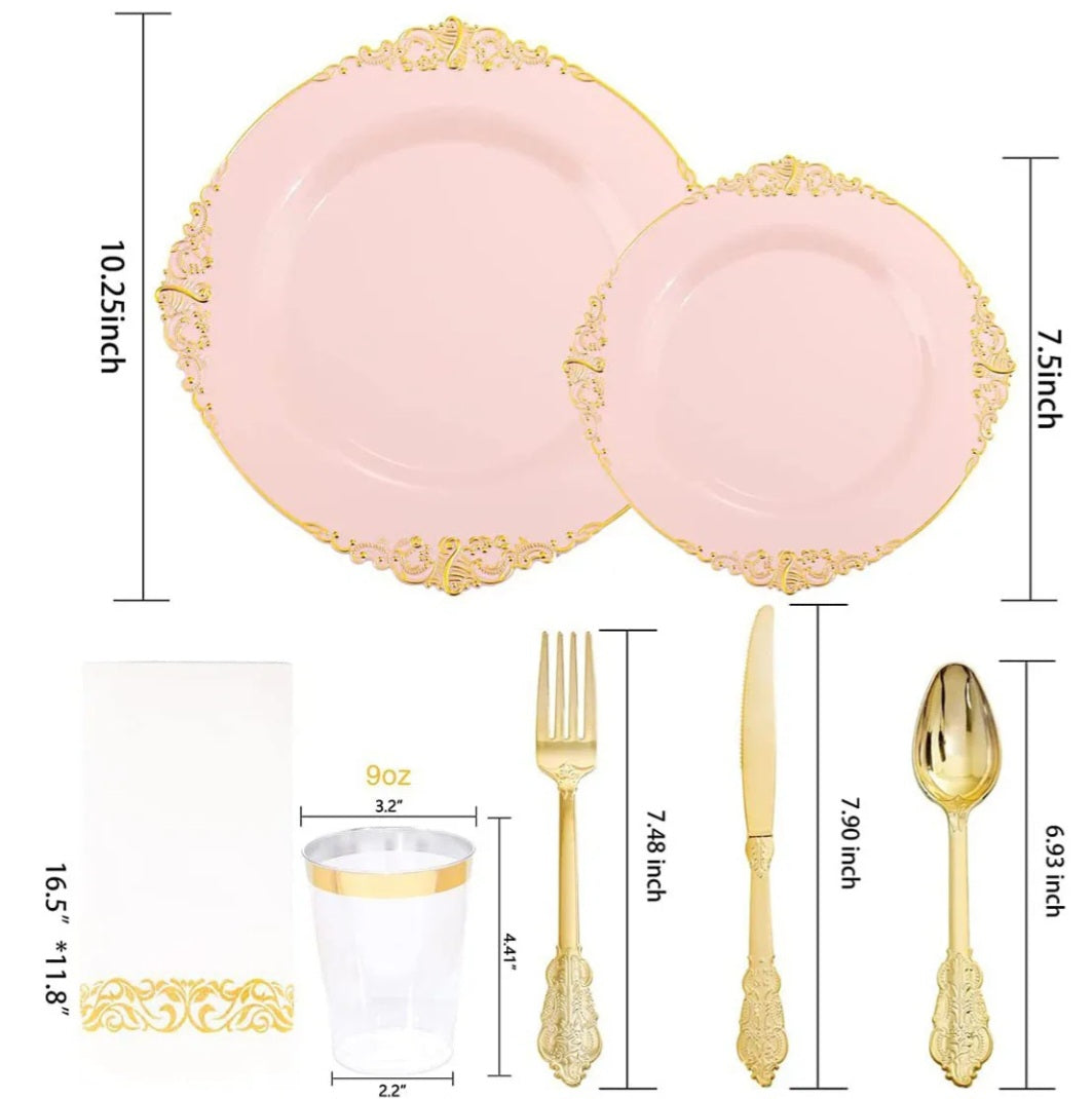25 Delig Luxe Roze/Gouden Plastic Tafelservies – Complete Set voor Feestelijke Gelegenheden