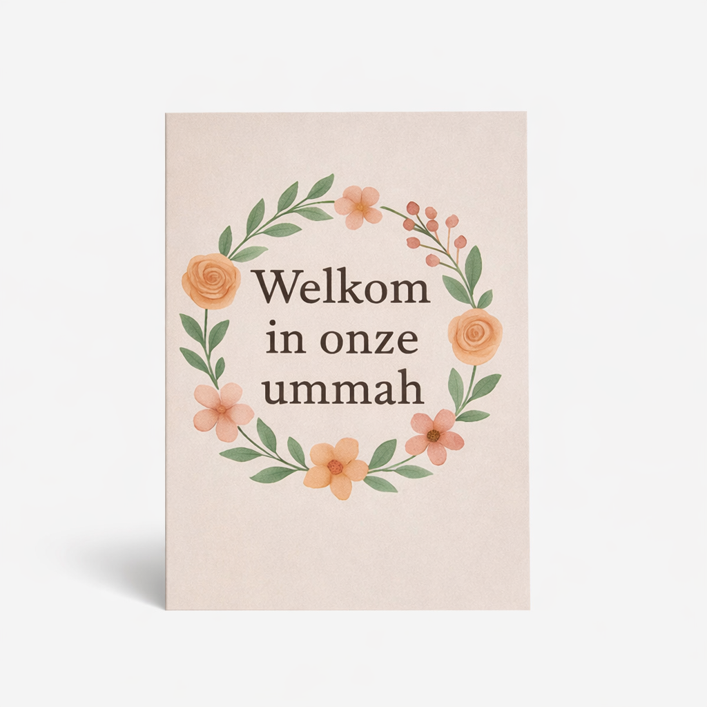 Vier een prachtige en betekenisvolle mijlpaal met deze elegante ‘Welkom in onze ummah’ kaart. Perfect om iemand te feliciteren met het aannemen van de islam en het uitspreken van de shahada. Het ontwerp straalt warmte en vreugde uit, met een sierlijke bloemenkrans in zachte pastelkleuren op een lichte achtergrond. Een kaart die niet alleen feliciteert, maar ook een gevoel van verbondenheid en liefde meegeeft.